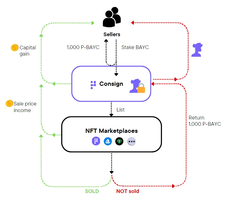 If eventually no one purchases this BAYC within 30 days, to get back the user's consigned BAYC, they need to pay back 1,000 P-BAYC.