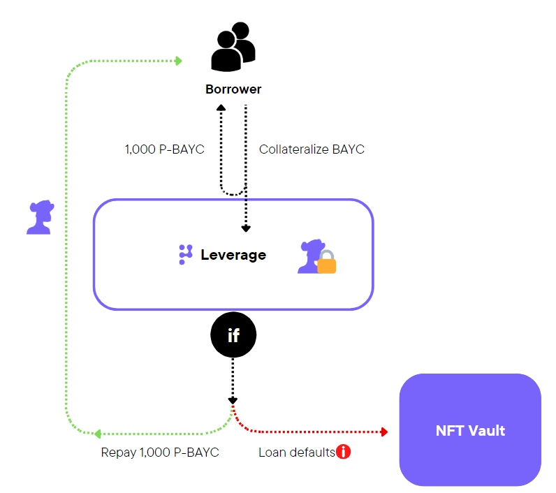 When borrowing P-Token against NFT in Polarise NFT Leverage module, borrowers will not be vulnerable to any liquidation risk due to price volatility during loan period. As long as borrowers pay back the calculated P-Token amount before expiration, they will be able to get back their NFT.